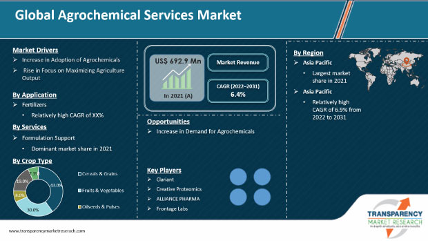 The global agrochemical services market is consolidated, with a small number of large-scale vendors controlling majority of the share. Several organizations are investing significantly in the study of agrochemical services. Key players operating in global agrochemical services market are Clariant, Creative Proteomics, ALLIANCE PHARMA, Frontage Labs, Intertek Group plc, PerkinElmer Inc, Bioneeds India Pvt. Ltd., Labcorp Drug Development, Baroda Agro Chemicals Ltd, JRF Global, and PI Industries.