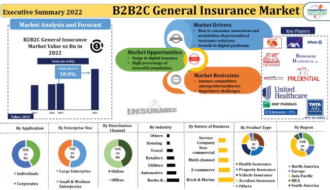 Rapid growth in omnichannel platforms and technical advancements such as artificial intelligence, machine learning, and data analytics are driving the adoption of B2B2C corporate insurance solutions. Insurance providers utilize data from businesses and customers to gain risk assessment insights and understand B2B2C general insurance market trends. This enables them to formulate innovative insurance products at dynamic pricing, and thus increase their B2B2C general insurance market share.
