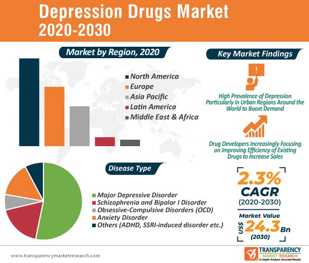 At the back of these factors, along with growing awareness regarding depression, the global depression drugs market is expected to attain a market value of US$ 24.3 Bn by the end of 2030. The evolving regulatory landscape, along with the fast-paced development of new depression medications are likely to influence the overall growth trajectory of the depression drugs market during the assessment period.