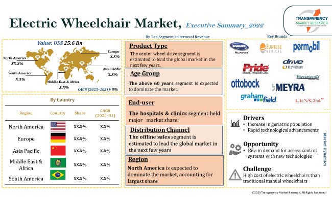 Increase in geriatric population, rise in disabilities, and surge in prevalence of chronic diseases are the key factors driving the global electric wheelchair market. Consumer preference for enhanced mobility and independence is also expected to propel market growth. Several current electric wheelchairs are equipped with advanced control system that allows users to operate them using a joystick or other control interfaces. These features allow easy mobility and navigation augmenting the market progress.