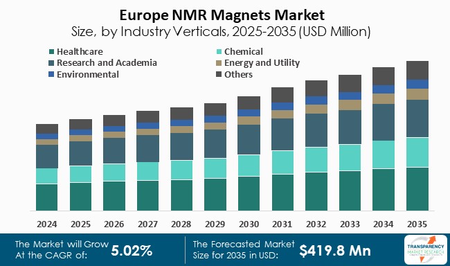 The Europe NMR magnets industry is expected to grow at a CAGR of 5.02% from 2025 to 2035.