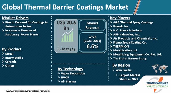 Development of stationary power plant facilities to meet the surging demand for energy is boosting the thermal barrier coatings industry growth. Thermal barrier coatings are employed in power generation facilities to increase turbine inlet temperature or reduce cooling requirements.